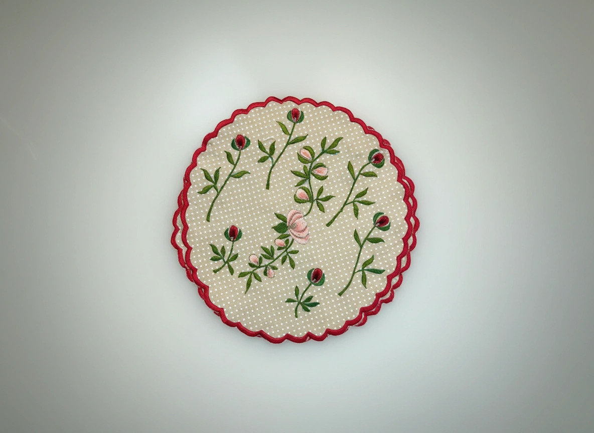 Delicate round doily crafted from fine fabric with pastel flowers and a scalloped mauve border. Perfect for tabletops or trays.
