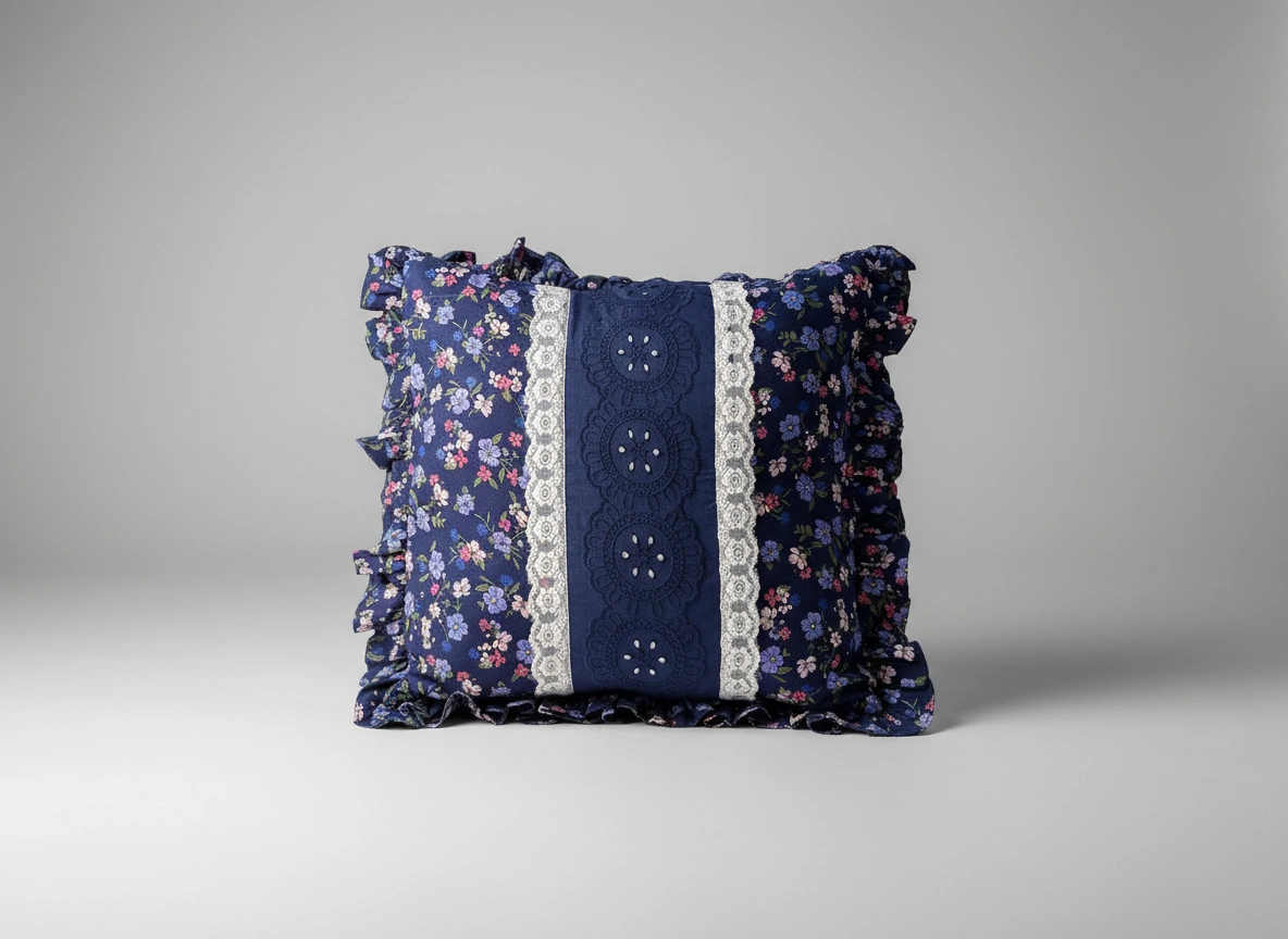 Bring a touch of vintage elegance to your home with the Midnight Floral Lace-Trimmed Cushion. Set against a deep navy blue background, this cushion features an all-over floral print in shades of lavender, pink, and soft green—creating a delicate, garden-inspired look. A central panel of embroidered cutwork adds artisanal texture, while two bands of white lace trim provide a refined, feminine finish. Ruffled edges in matching floral fabric complete the charming, cottagecore aesthetic.