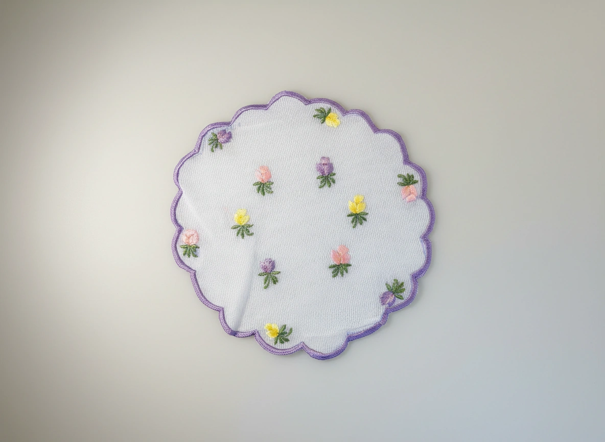 Charming round decorative doily with scalloped lavender border and embroidered floral motifs. Vintage-inspired refined aesthetic.